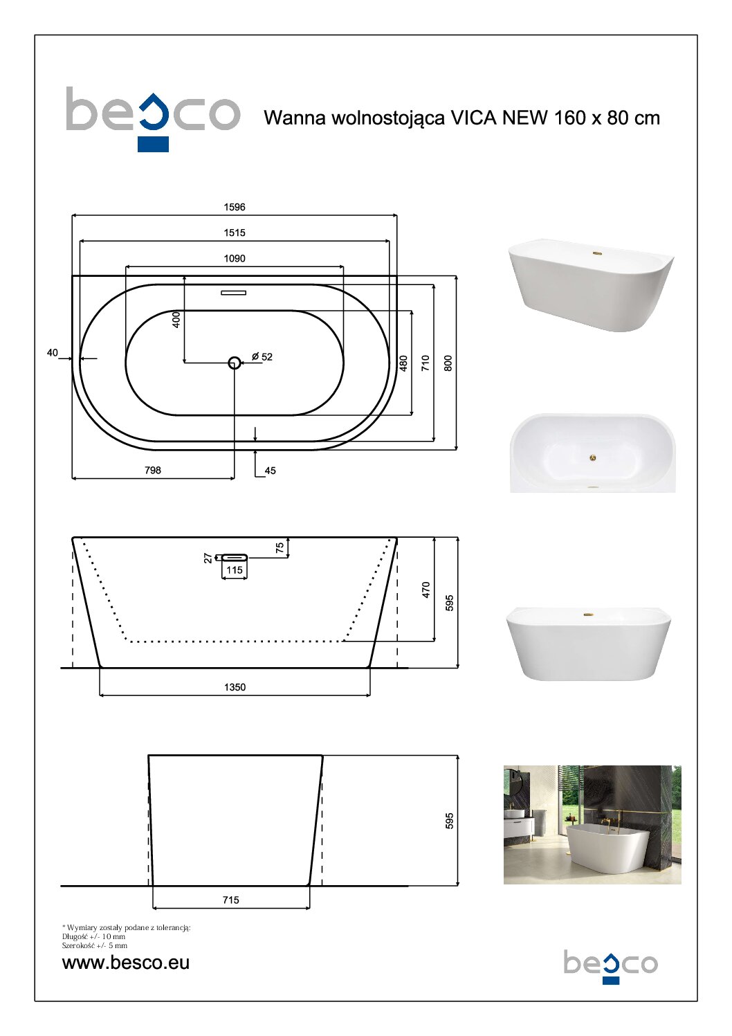 • Waga wanny netto: Vica New 150 – 46 kg, Vica New 160 – 47 kg, Vica New 170 – 49 kg